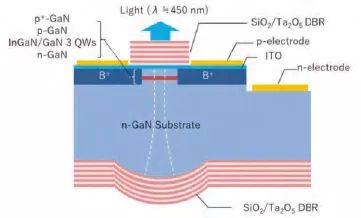 GaN VCSEL 器件的制备流程是,首先将一个 n 型 GaN 衬底装入 MOCVD 反应室,并沉积一个外延堆栈,该堆栈包括一个 n 型 GaN 层,一个具有 3 个 InGaN 量子阱的活性区域,以及一个 p型 GaN 层。接着进行的是真空沉积(添加一个氧化铟锡层),随后是一个顶端分布式布拉格反射器(DBR),其由 7 对 Ta₂O₅ 和 SiO₂ 制成。需要注意的是,这个 DBR 中的材料层数少于 Sony 以前制造的 VCSEL,旨在提高光取出效率。