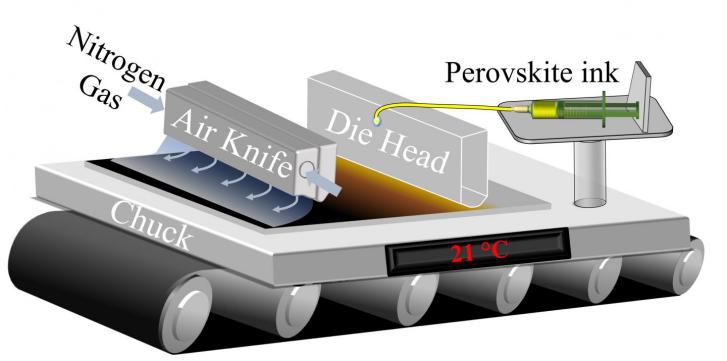 上图显示了钙钛矿前体,溶剂和添加剂的液态溶液从狭缝形喷嘴流到下面传送的玻璃基板上的情况。